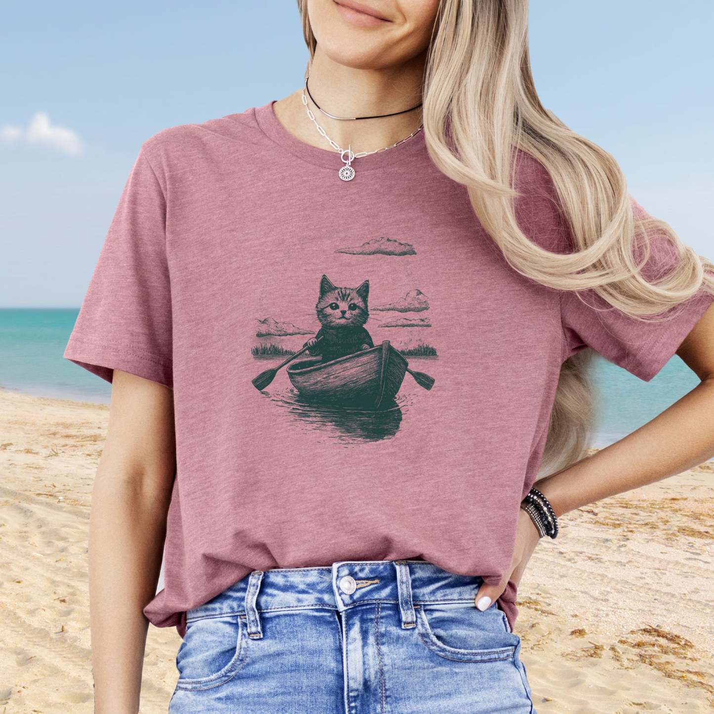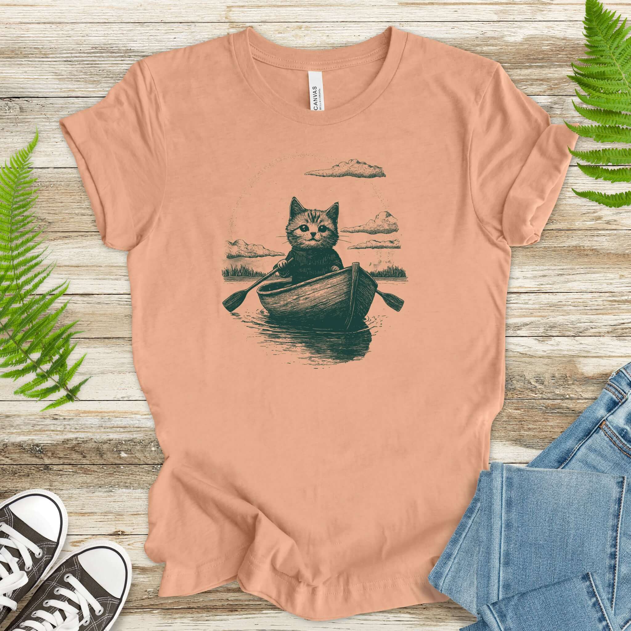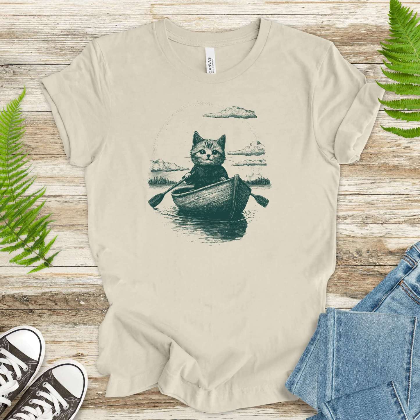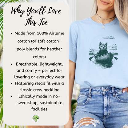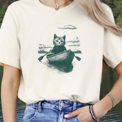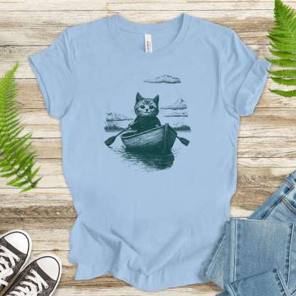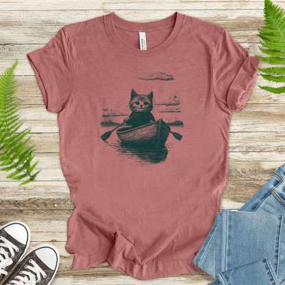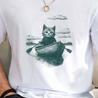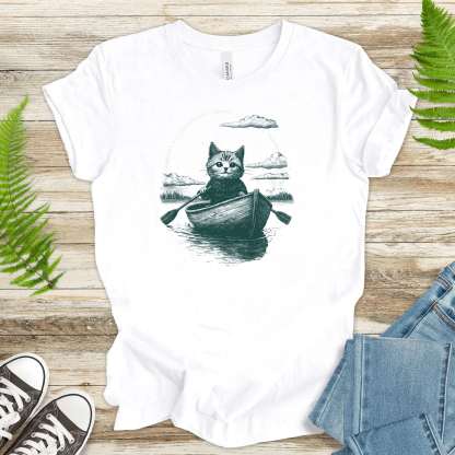 Drifting through unknown waters with unknowable thoughts—our Mysterious Rowboat Cat T-Shirt features a surreal black sketch of a lone cat in a tiny rowboat, floating across a still lake. Quiet, strange, and oddly poetic, this design is perfect for lovers of weird art, moody vibes, and cats who might just be on a secret mission.
