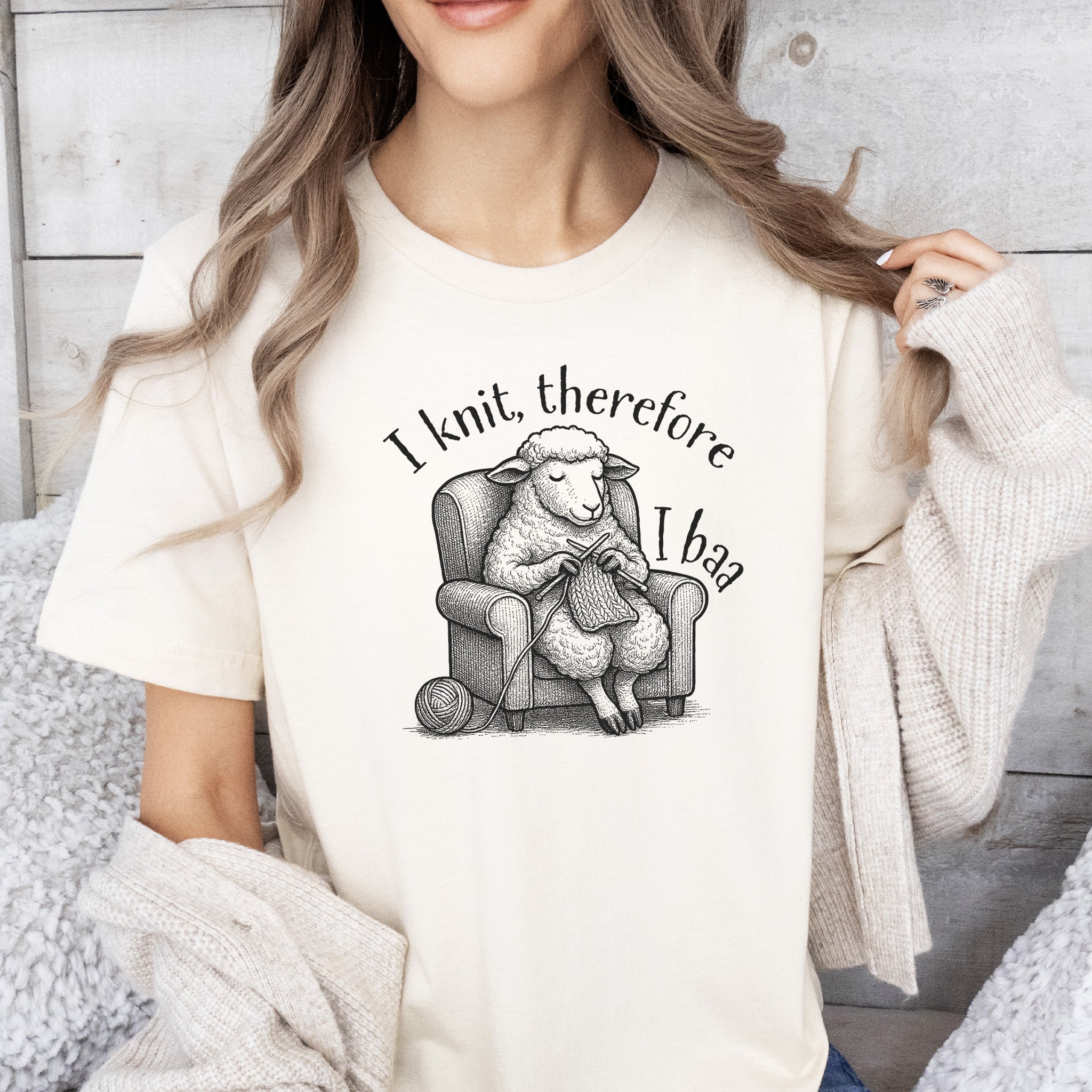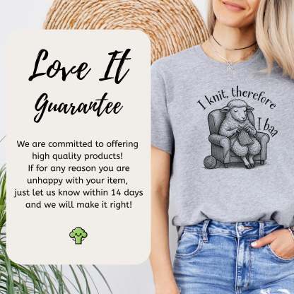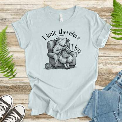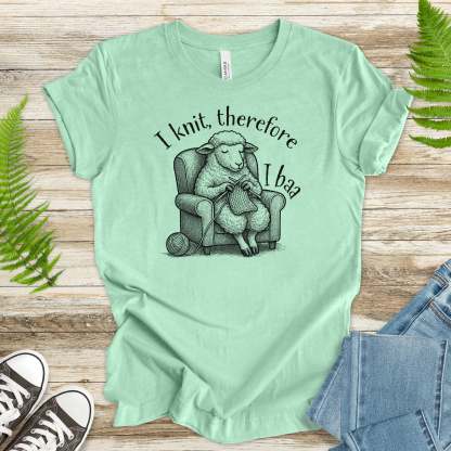 “I knit, therefore I baa.” Deep thoughts from a sheep in a cozy chair, proving woolly wisdom comes one stitch at a time. Whether you knit to relax or unravel slowly, this tee gets you.