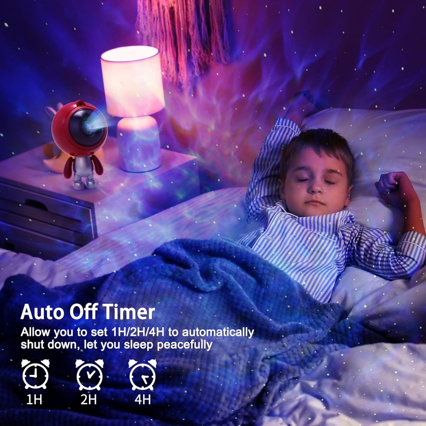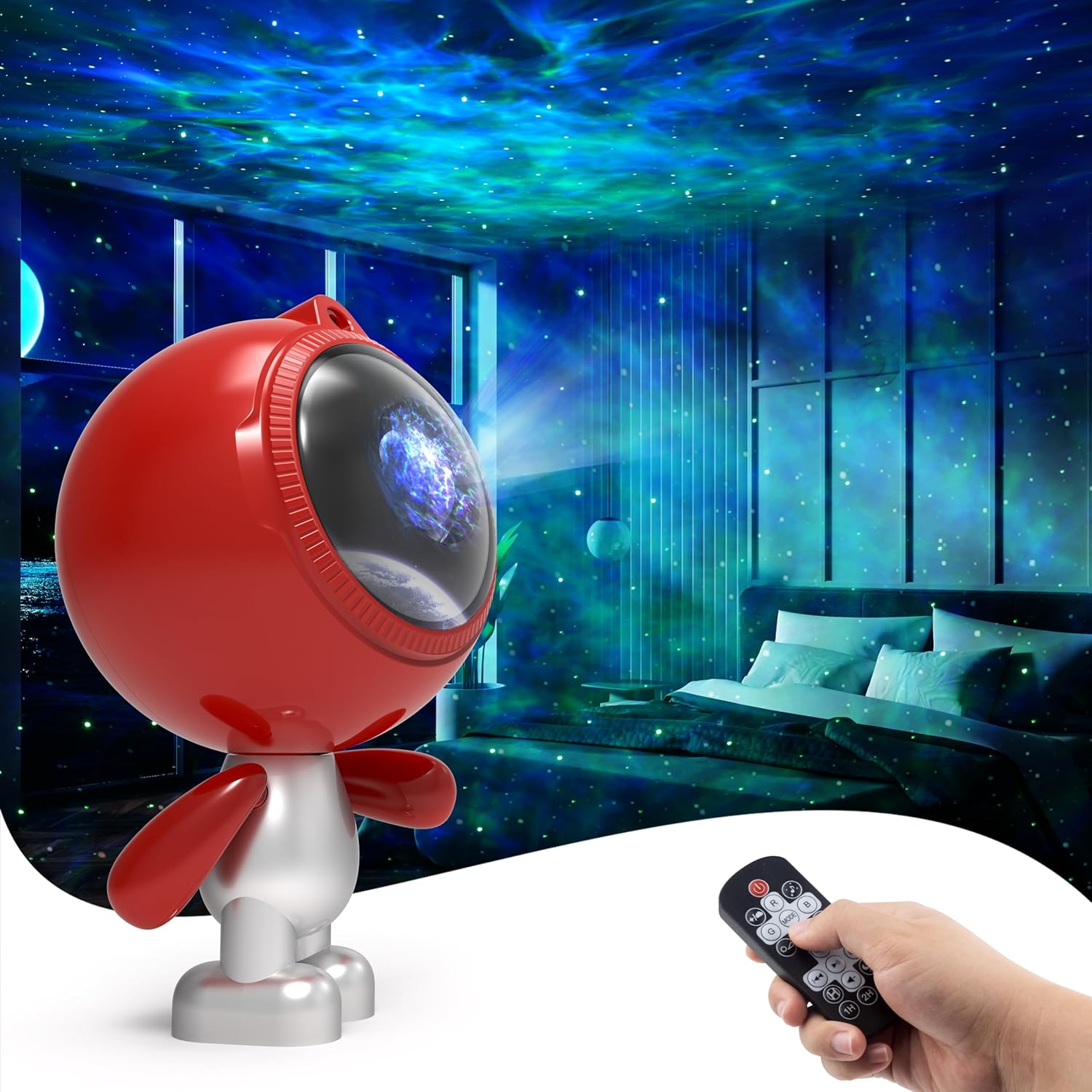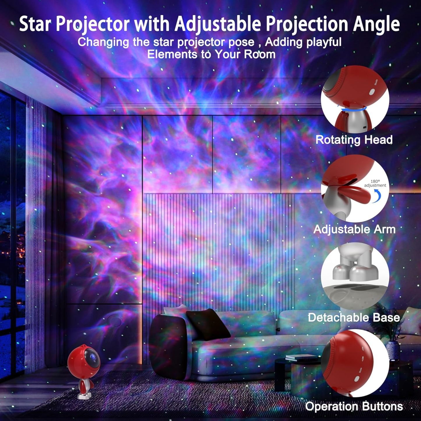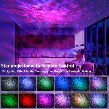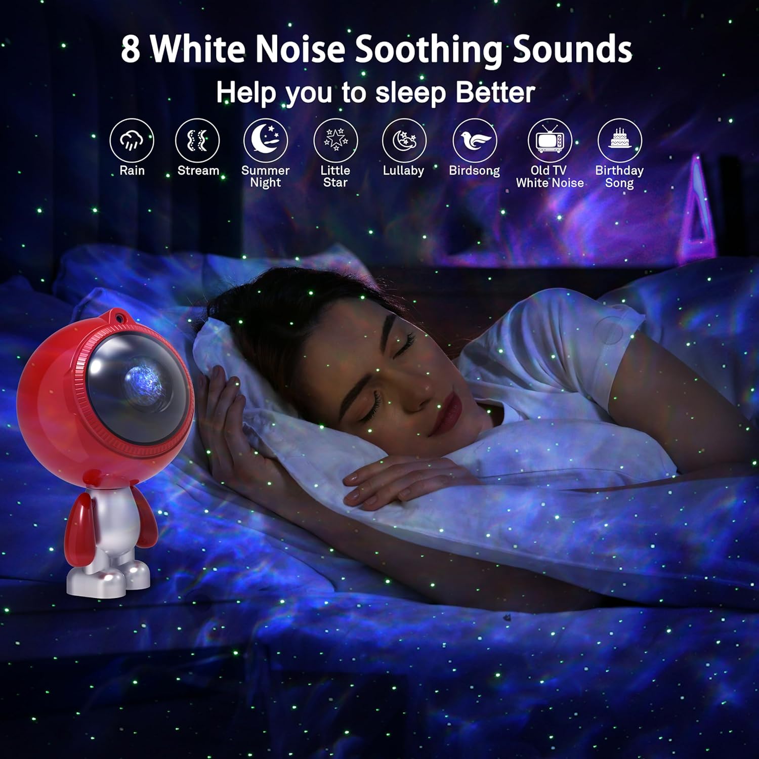 3 in 1 Star Projector: The star projector has been upgraded to 3 in 1 version, it combines star projector lights, white noise machine and bluetooth music speaker all in one, it’s quite nice to have background music with funny lights, creating relaxing atmosphere with soothing music, bring you a extraordinary visual and auditory experience. Entering into the projection mode, there are red, green, blue and white 4 colors for you to choose which can create various lighting effect, give you a impressive light journey. Unique Design: The star projector features with unique innovative design. The head of the projector can be rotate to 180 degree for different projection angle, you can projector the light to wherever you want. The arm of the star projector can be adjusted for changing the star projector pose, or you can swing the arms back and forth, it will make a funny low hum like a machine, adding extra charm and playful element to your room. When you feel tired, you can swing the arms of the star projector, you will feel relaxed. Built-in Bluetooth Speaker & Sound Activated: Designed with 5.0 bluetooth speaker function, once paired with your phone, our star galaxy projector night light allow you to play your music while projecting the lights, watching the lights move rhythmically with your music is amazing when turn on the “ Sound Activation Mode”. Creating you a relaxing & fun atmosphere with soothing music, let you enjoy music and inspire a happy mood under beautiful, romantic and peaceful moving lights. 15 Lighting Mode Effect: The star projector night light has 15 different fantastic nebula lighting effect with twinkling green stars. Projecting stars and galaxies onto the wall or ceiling, making you feel like you are in a vast galaxy, creating stunning galaxy starry atmosphere and cozy ambiance, perfect for relaxation and entertainment, nice choice for your bedroom or room decor. Remote control and Auto-off Timer: The galaxy star projector offers 2 operation method, button control and remote control. The side physical buttons on the head allow you to power on/off the star projector. The other touch buttons enable you switch between nebula and starry sky modes, switch songs, adjust volume, switch the built-in white noise. With the remoter control, you can operate many functions as you like, such as set timer, adjust the flow speed and etc. Widely Use & Great Gift Choice: The star light projector is wonderful ideal decoration for your living room, dinning room, front porch, bedroom, bathroom, kids room, computer room, game room, home theatre, parties, festival celebrations and so on. The projection lamp is also a great gift option for your family & kids on Birthday, Valentine's Day, Children's Day, Halloween, Christmas, Wedding and Anniversary, they will absolutely love it, bring them a stunning & gorgeous tour of galaxy nebula star lights.
